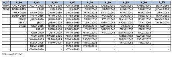 1. First, in each year of our sample (so going back to our first strategy launch on December 1, 2021), we identify those target date funds which fall into the risk bucket associated with each of our tactical strategies, e.g., 60/40, 70/30, and so on. Because TDFs change their risk exposures over time, the set of TDFs falling into each risk bucket also changes over time. The most recent funds in each of our risk buckets are: