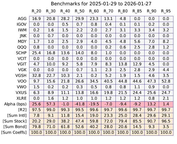 This table is a lot to take in, so let’s go through it. Each column corresponds to the ETF replicating portfolio for a given risk bucket. For example, the 85/15 column (labeled R_85) shows the ETF replicating portfolio that runs at the same risk level as our 85/15 tactical risk strategy, i.e., 85% stock and 15% Treasury bond risk. This portfolio has 3.3% allocated to small caps (IWM), 5.6% to midcaps (MDY), 12.9% to intermediate-duration Treasuries (VGIT), 24.4% to international non-US stocks (VXUS), and so on.