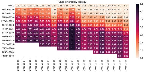 The above chart shows the risk level of different target date funds offered by Fidelity over time. Each cell represents the stock weight of each TDF in each year of the sample (e.g., 0.40 means the fund ran at the 40/60 stock/Treasury bond risk level in a given year). Notice how the earlier vintage funds, e.g., 2020, 2025, etc., have declining risk levels over time. This happens because funds reduce their risk exposures as their investors approach retirement.