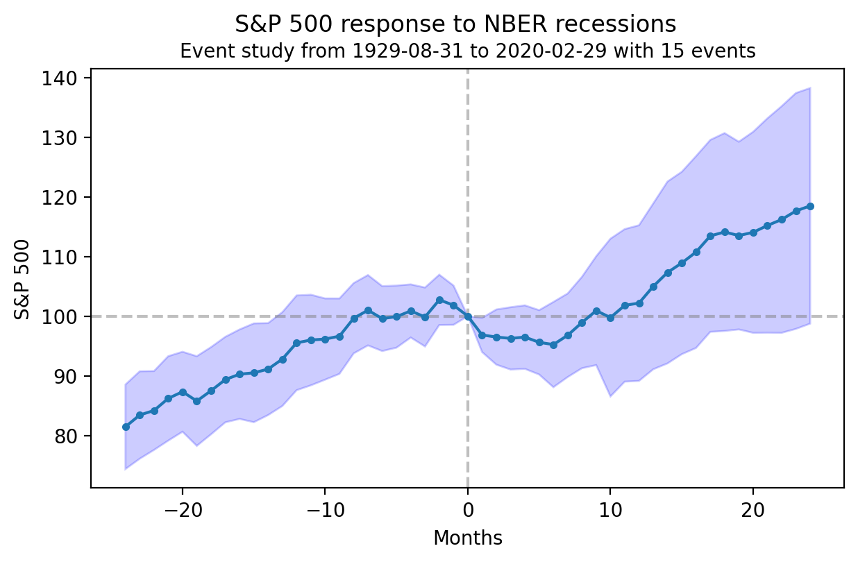 Should a recession arrive, it is not necessarily doom and gloom for stocks. In a piece we wrote two years ago, we showed that the average stock market response around NBER recessions involves a roughly 10% market drop from a peak reached a few months prior to a recession to the trough reached a few months after the recession’s start. However, in the two-year period following a recession start, the stock market tends to do well, showing a roughly 20% gain from the recession start on average.