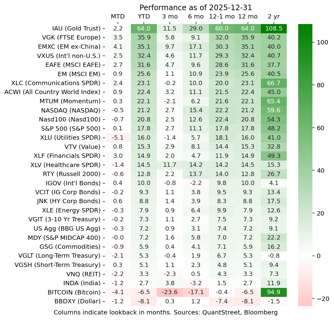 2025 saw a reversal of a long-standing trend of U.S. outperformance relative to the rest of the world. U.S. risk assets lagged their global peers in local currency terms, and especially in dollar terms thanks to the dollar’s 8% depreciation in 2025. For reasons we’ve discussed in the past, gold was the leading risk asset in the world, followed by all manner of global stock market, Europe, EM, and the rest of the world more broadly. Within the U.S., tech and communications continued to lead the way, with U.S. markets broadly posting a more-than-respectable 17.8% return on the year.