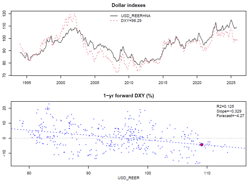 One important measure of the dollar’s valuation is the BIS real effective exchange rate which measures, roughly speaking, the trade-weighted cost to foreigners of buying a basket of U.S. goods divided by the cost of buying (a sort of similar) basket of their own domestic goods. The higher this ratio, the richer are U.S. products relative to non-U.S. ones. As the next chart shows (black line) the dollar real effective exchange rate (REER) is at multi-year highs despite the dollar’s 2025 selloff. We will write more about this on our Substack, so if you don’t already subscribe please do so here.