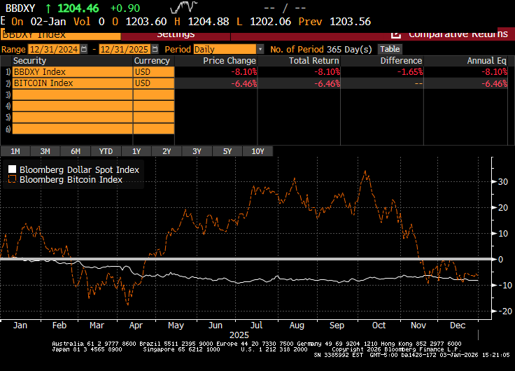 Excluded from the party, however, were two asset class. The dollar was kicked out of the festivities early on and never managed to claw its way back. Bitcoin–for reasons that have never been clear to us–was having a great year up until early October, when it suffered its own swoon, ending the year just shy of the dollar’s losses (which means bitcoin in non-dollar terms had an even more miserable year).