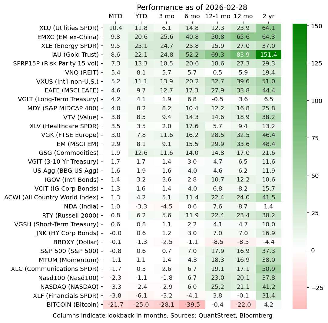 AI fatigue has taken hold of financial markets. The companies powering the AI revolution (Nvidia, Google, Microsoft) were down. The companies that are being (or might be) disrupted by AI, like software makers, were also down. Bitcoin, with no obvious connection to the AI nexus, also took a beating. Financials, while benefiting from the Trump administration’s deregulatory agenda, sold off on concerns about private credit hiccups (like the Blue Owl fund redemption gate and the insolvency of MFS in the UK). The winners included utilities, energy (on the back of concerns about a US attack on Iran, which started on February 28, 2026), gold, and most things international. The dollar was flat on the month but investor preference for more non-US exposure continues unabated.