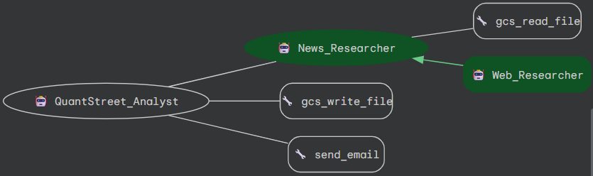 At 9:45pm New York time, QuantStreet_Analysis wakes up and calls another agent, News_Researcher, to scan and summarize the day’s news. News_Researcher calls a third agent, Web_Researcher, to use Google’s search capabilities to scan the internet for the day’s important news. News_Researcher then calls a tool called gcs_read_file to read in QuantStreet’s latest portfolio positions, and then creates a summary of the day’s news and how it’s relevant to QuantStreet’s positions. This information is then passed back to QuantStreet_Analyst which uses a tool (gcs_write_file) to save the information on our cloud storage for future reference. As the final task, QuantStreet_Analyst uses another tool (send_email) to email this summary to us for our review.