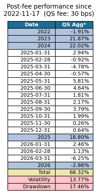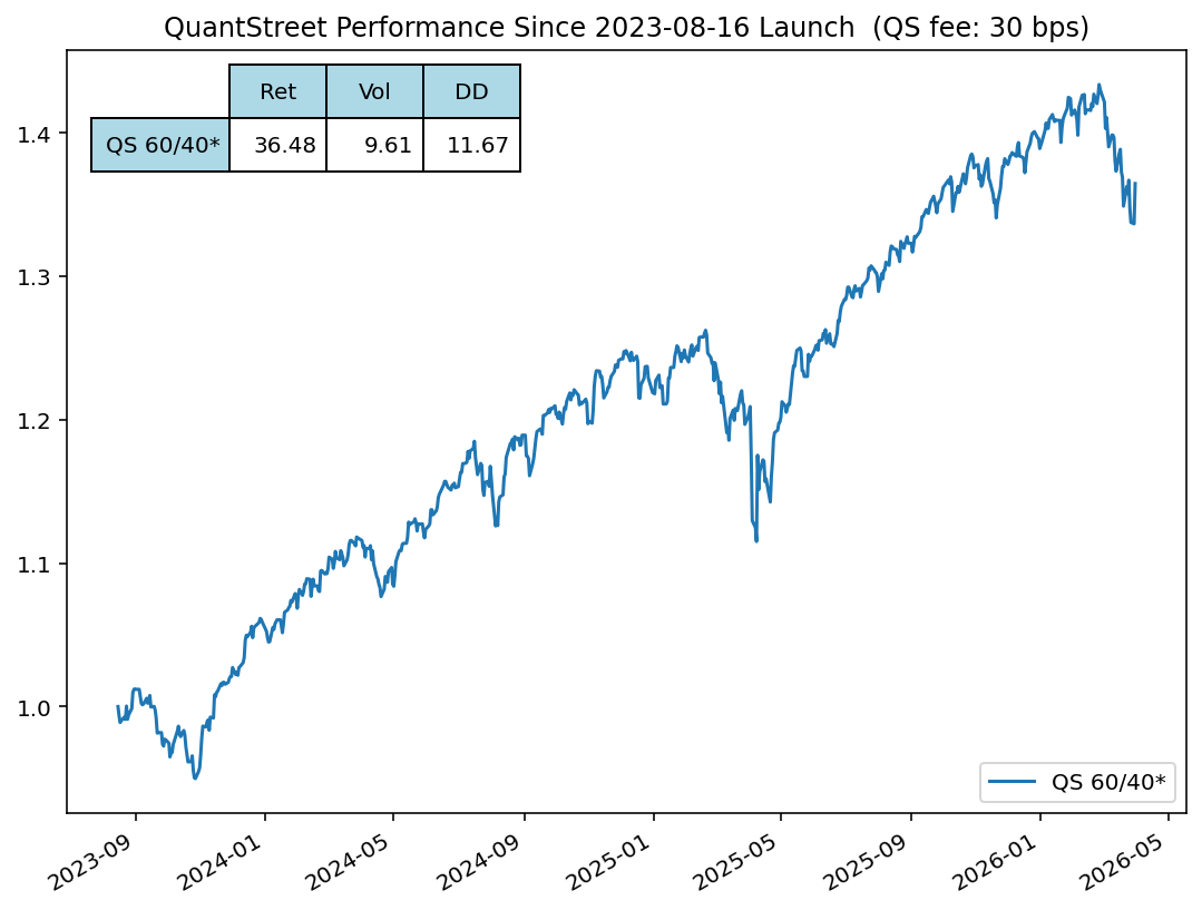 All performance is shown after deducting the above hypothetical fees. Fees are shown in basis points (1 bp = 0.01%). Each strategy targets a risk level corresponding to the stock/bond mix shown in the Risk Level column. Each strategy can deviate from the targeted risk level at the discretion of QuantStreet. We changed the hypothetical fee to 30 basis points (from 40) as of 11/29/2025 to reflect what we charge client accounts for whom we provide only investment but no financial advisory services. Fee levels vary across clients.