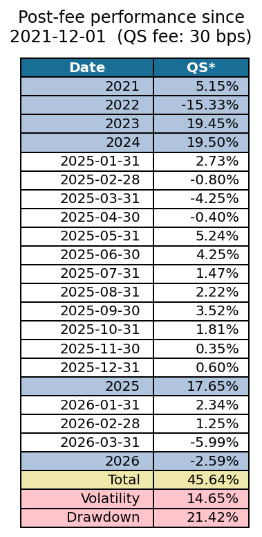 - The table shows monthly and annualized net-of-fee (after-fee) returns.