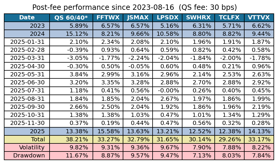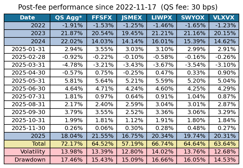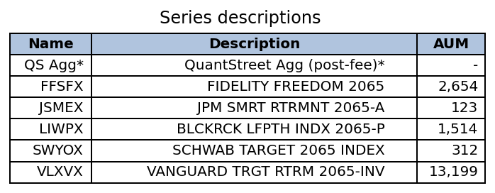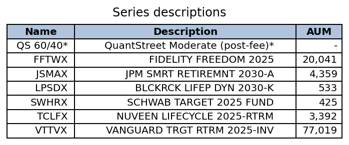 All performance is shown after deducting the above hypothetical fees. Fees are shown in basis points (1 bp = 0.01%). Each strategy targets a risk level corresponding to the stock/bond mix shown in the Risk Level column. Each strategy can deviate from the targeted risk level at the discretion of QuantStreet. We changed the hypothetical fee to 30 basis points (from 40) as of 11/29/2025 because this is what we charge client accounts for whom we provide only investment but no financial advisory services. Fee levels vary across clients.