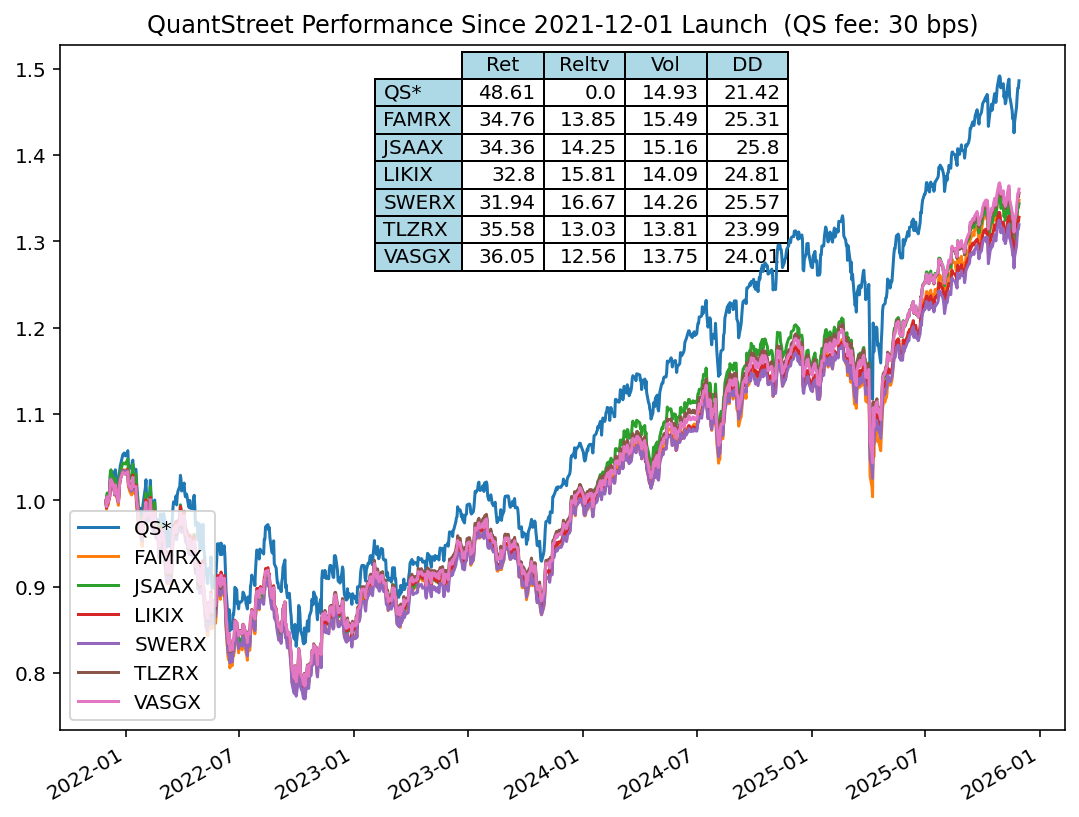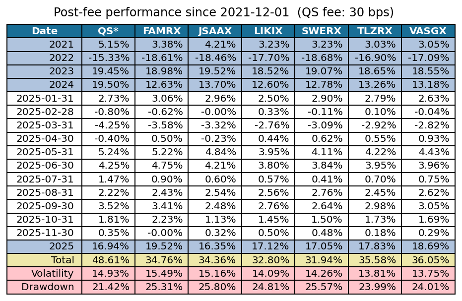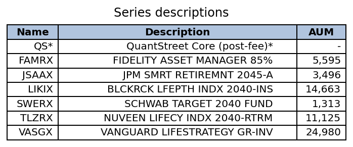 The QS* column shows the post-fee performance of QuantStreet’s strategy from the start date. The other columns correspond to the returns of other asset allocation mutual funds over the same time period.