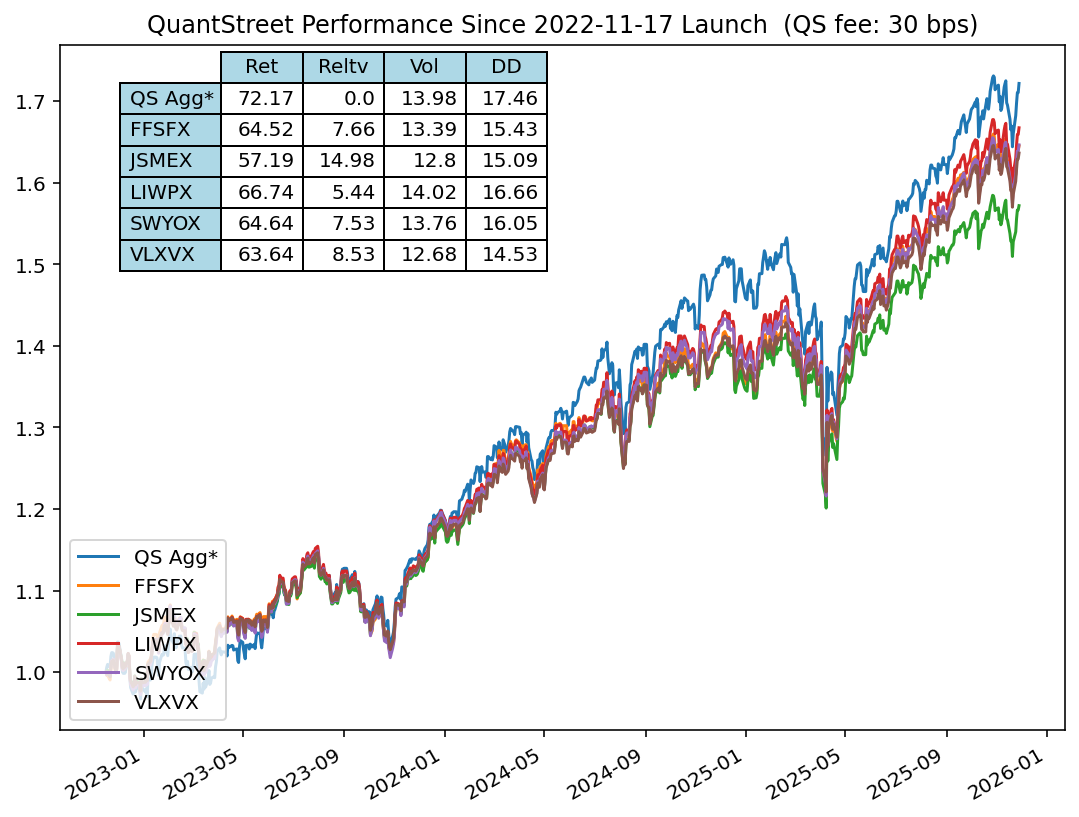 The QS Agg* column shows the post-fee performance of QuantStreet’s strategy from the start date. The other columns correspond to the returns of other asset allocation mutual funds over the same time period.