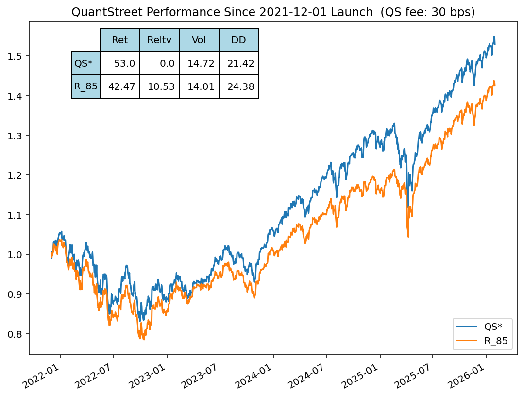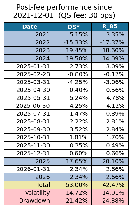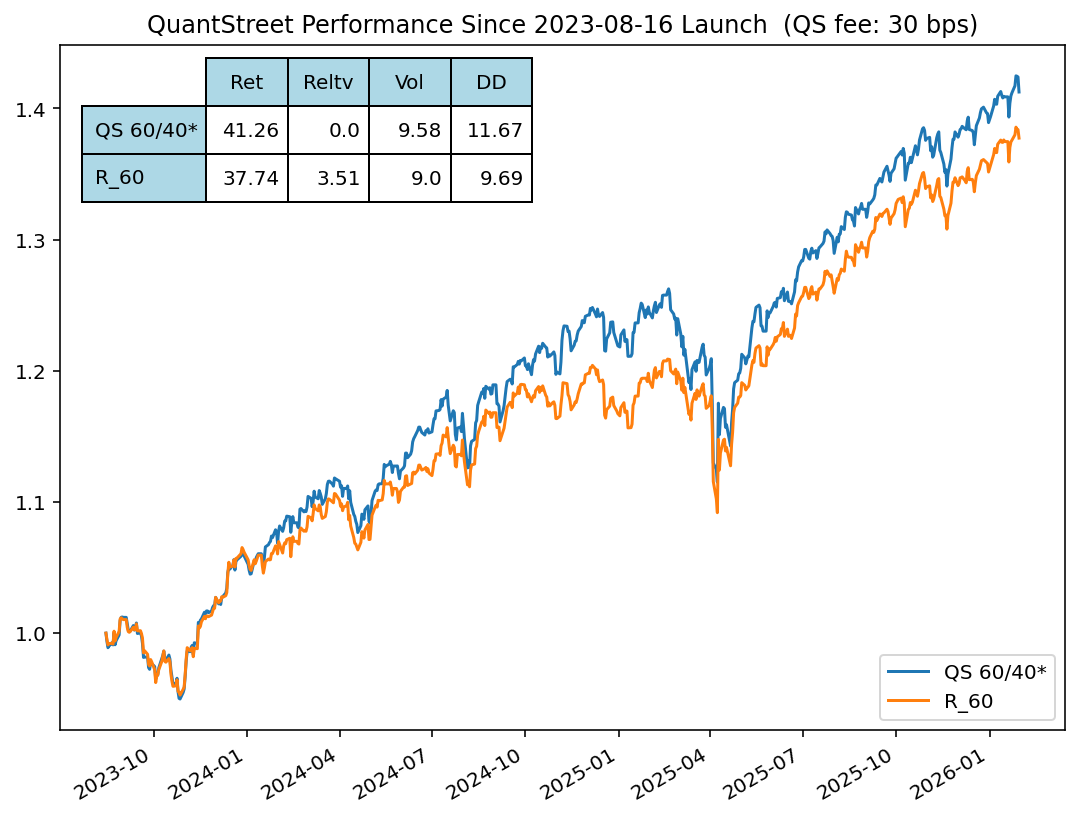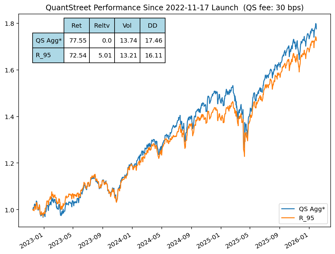 All performance is shown after deducting the above hypothetical fees. Fees are shown in basis points (1 bp = 0.01%). Each strategy targets a risk level corresponding to the stock/bond mix shown in the Risk Level column. Each strategy can deviate from the targeted risk level at the discretion of QuantStreet. We changed the hypothetical fee to 30 basis points (from 40) as of 11/29/2025 to reflect what we charge client accounts for whom we provide only investment but no financial advisory services. Fee levels vary across clients.