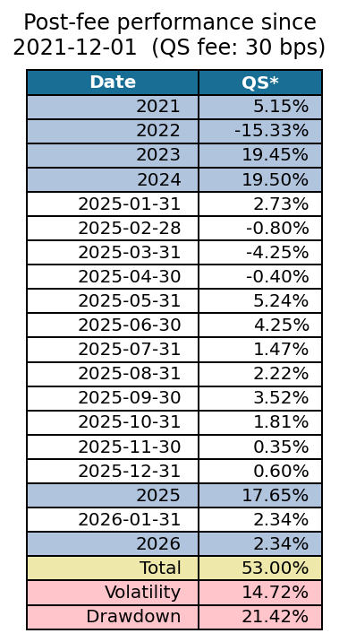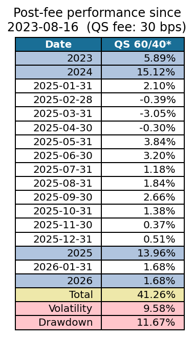 All performance is shown after deducting the above hypothetical fees. Fees are shown in basis points (1 bp = 0.01%). Each strategy targets a risk level corresponding to the stock/bond mix shown in the Risk Level column. Each strategy can deviate from the targeted risk level at the discretion of QuantStreet. We changed the hypothetical fee to 30 basis points (from 40) as of 11/29/2025 to reflect what we charge client accounts for whom we provide only investment but no financial advisory services. Fee levels vary across clients.