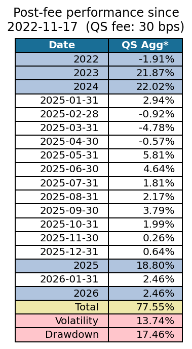 - The table shows monthly and annualized net-of-fee (after-fee) returns.