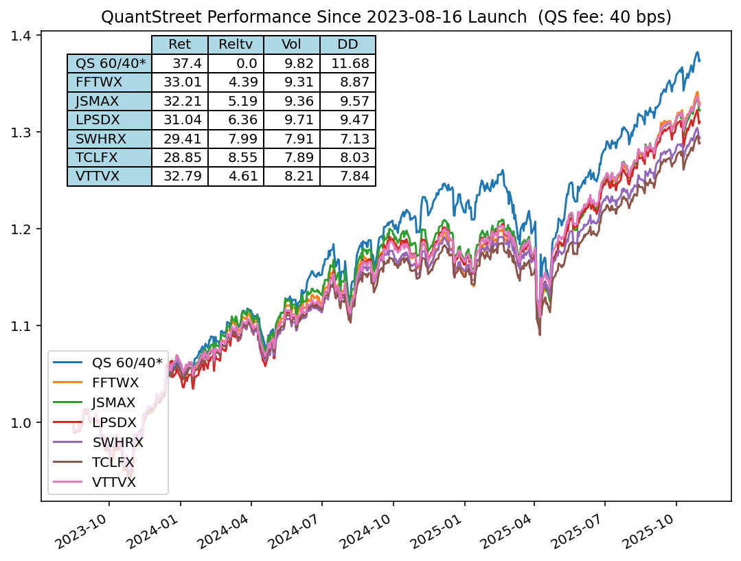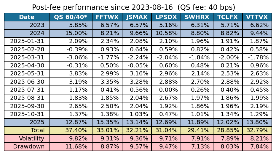 The QS 60/40* column shows the post-fee performance of QuantStreet’s strategy from the start date. The other columns correspond to the returns of other asset allocation mutual funds over the same time period.