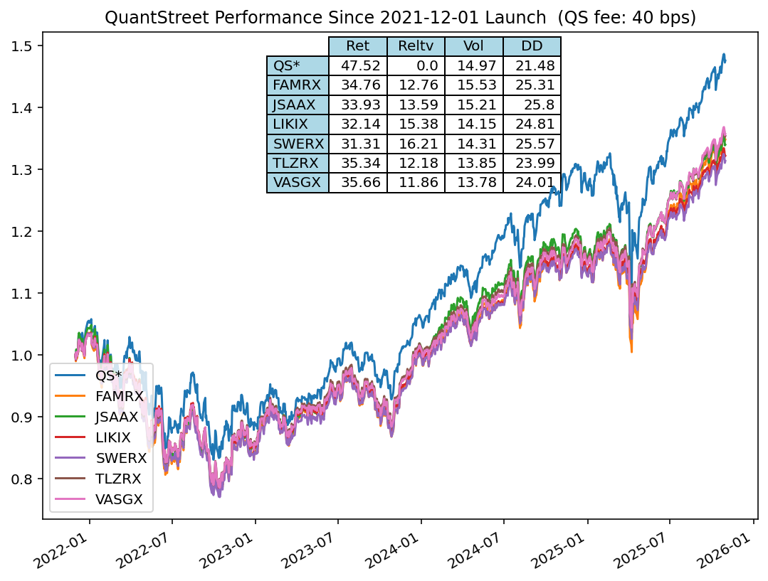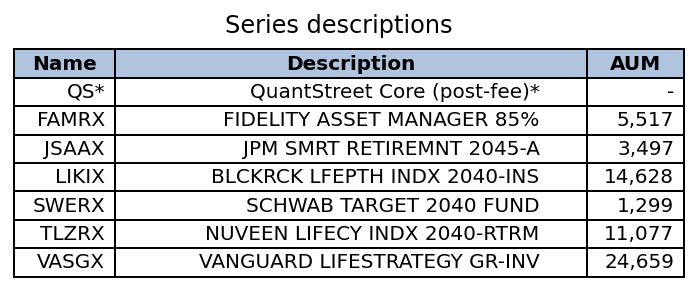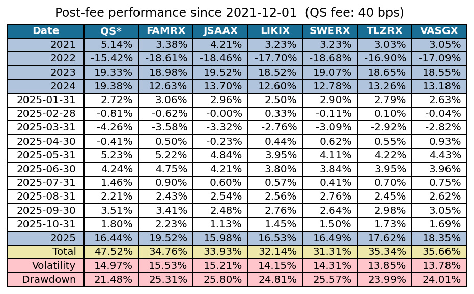 The QS* column shows the post-fee performance of QuantStreet’s strategy from the start date. The other columns correspond to the returns of other asset allocation mutual funds over the same time period.