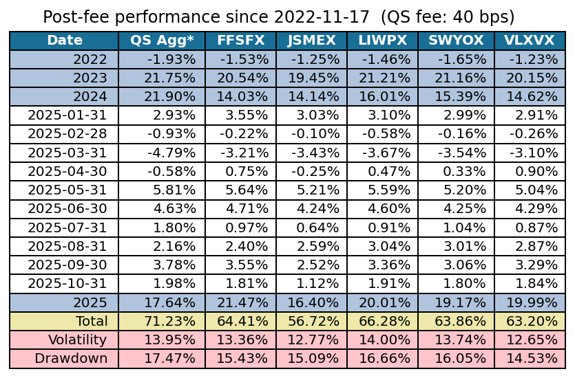 The QS Agg* column shows the post-fee performance of QuantStreet’s strategy from the start date. The other columns correspond to the returns of other asset allocation mutual funds over the same time period.