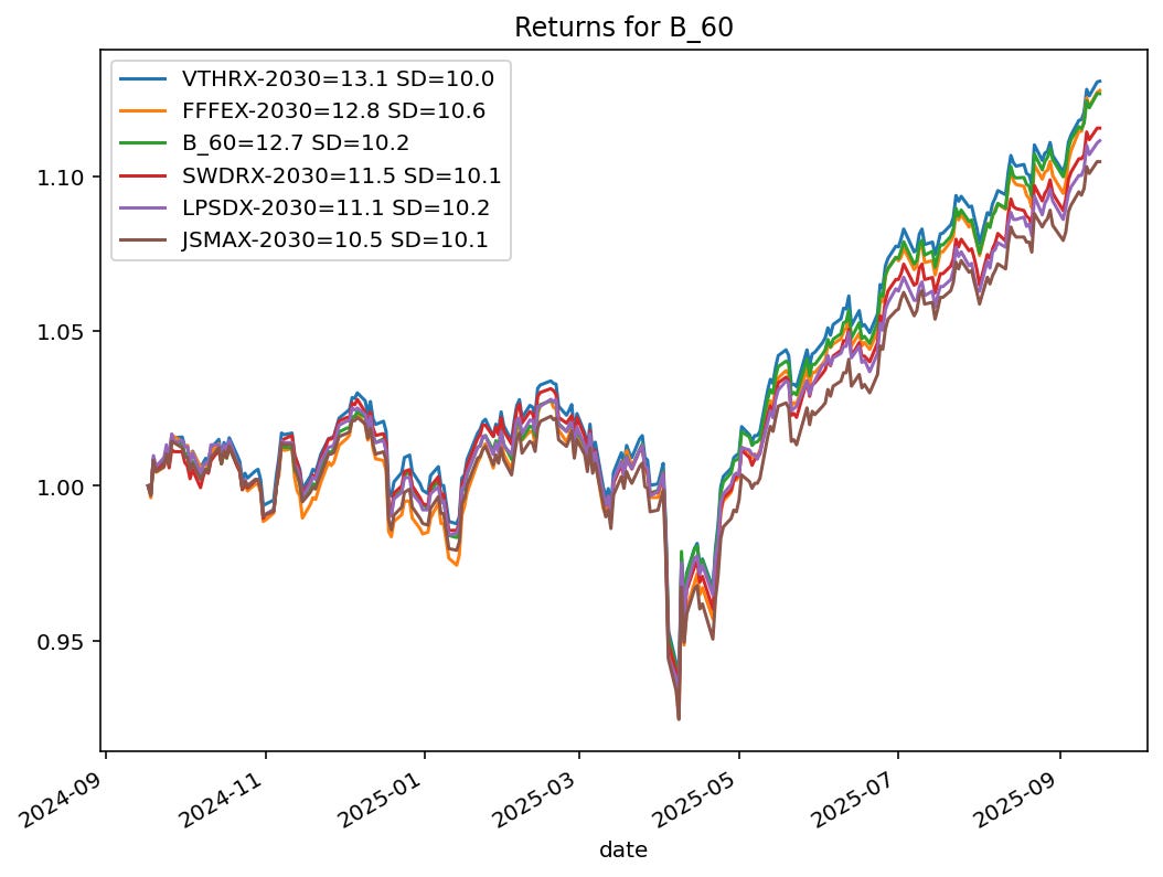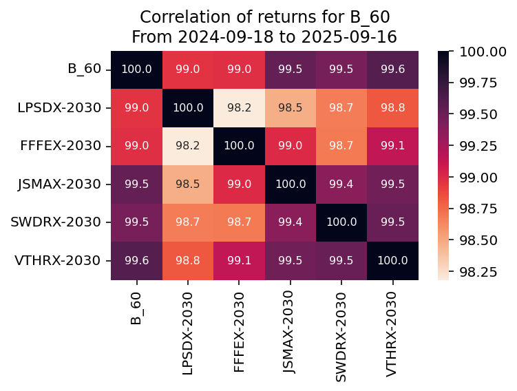 The next table shows the correlation of daily returns of the factor replicating portfolio for the 60/40 TDF index (labeled B_60) with the five target date funds that were classified into the 60/40 risk level over the last year. (The names of these funds, which have retirement dates of 2030, are shown in Appendix A.) The daily returns of B_60 have a correlation with the daily returns of the 60/40 TDFs of between 99% and 99.6% (see the top row in the table). Clearly, the factor replicating portfolio does a very good job capturing the variation in 60/40 TDF returns.