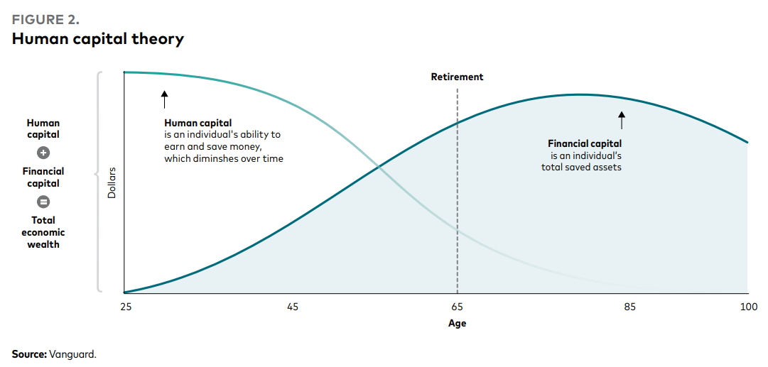 Target date funds represent the investment industry’s best thinking about how people should invest for retirement. The idea is that young people have the majority of their wealth in the form of human capital, which is a bond-like asset. Therefore, to balance out their overall portfolio, which is human capital plus financial capital, the young should invest most of their financial capital into stocks. As people age, their financial capital rises, while their human capital falls. To maintain balance in their overall portfolio, older investors should therefore allocate a larger portion of their financial capital to bonds. The next chart, taken from a Vanguard white paper on the topic, illustrates the idea: