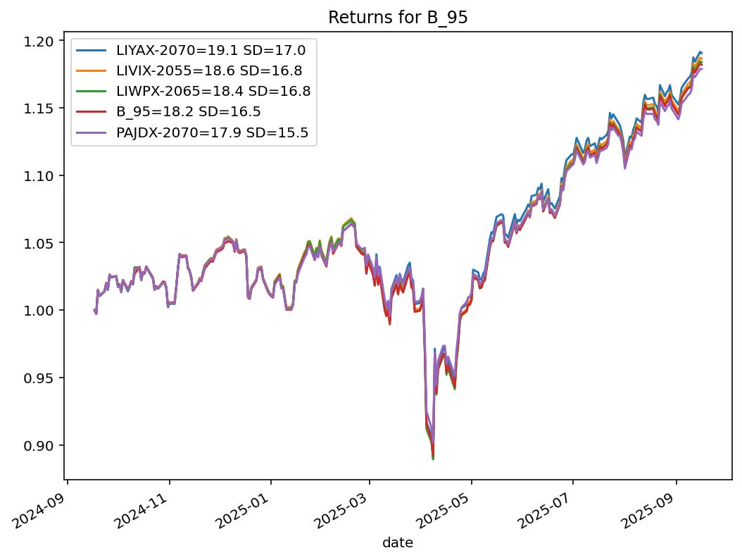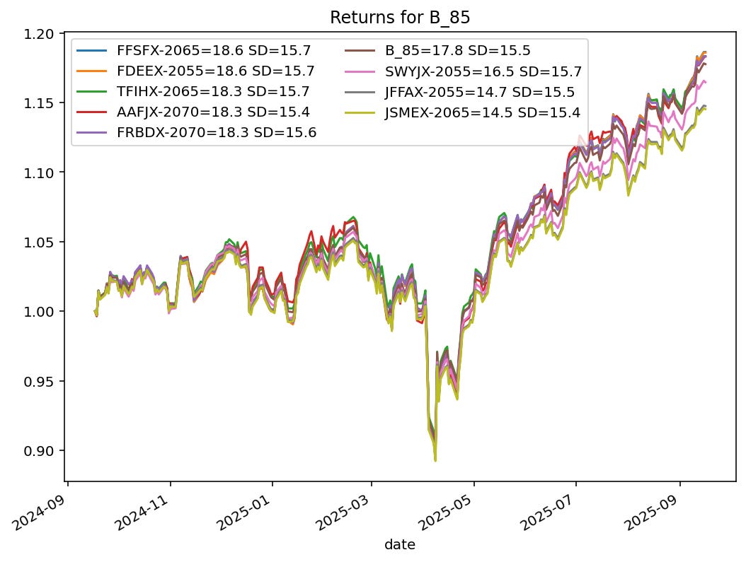 The next chart shows the current value of $1 invested one year ago in the target date funds being tracked by the 85/15 replicating portfolio, as well as the value of $1 invested in the 85/15 replicating portfolio (B_85).