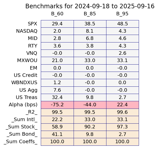 The _R2_ row shows that the 60/40 replicating portfolio captures 99.5% percent of the variation in daily returns of the target date funds index, thereby providing a very effective replication strategy. The _Sum Intl_ row shows that 22.2% of the 60/40 portfolio is allocated internationally, mostly to stocks but some to bonds. The _Sum Stock_ and _Sum Bond_ rows show that 58.9% of the portfolio is in stocks and 41.1% is in bonds. Finally, _Sum Coeffs_ verifies that portfolio weights add up to 100%.