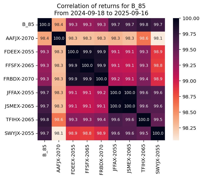The next table show the correlations of daily returns of the target date funds being tracked by the 85/15 replicating portfolio with one another and with the B_85 replicating portfolio. All correlations are very high.