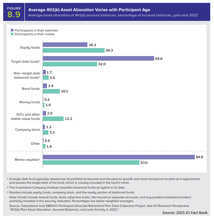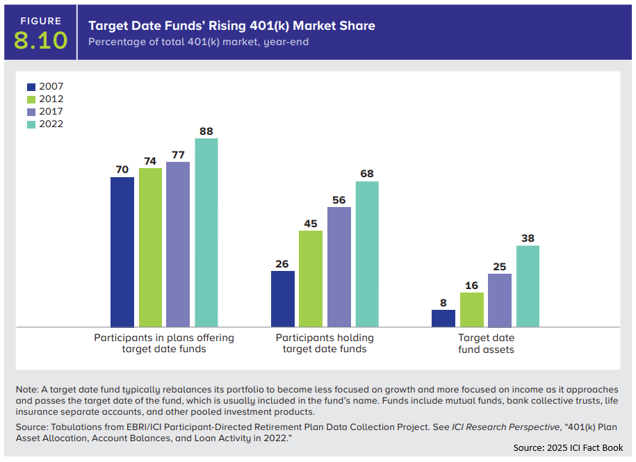 The annual Investment Company Factbook provides extensive statistics on the market penetration of target date funds. According to the 2025 Fact Book, 401(k) participants who are currently in their twenties have close to two thirds of their total assets allocated to target date funds. For the younger generations, TDFs are their primary savings vehicle in 401(k)s.