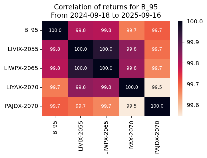 The correlations of daily B_85 returns (the 85/15 replicating portfolio) with the daily returns of TDFs classified into the 85/15 bucket over the prior year range from 98.4% to 99.8%. In fact, these correlations are all above 99.3%, except for the correlation with the returns of AAFJX (the American Funds 2070 Target Date Retirement Fund). For B_95, which replicates the returns of TDFs matched to the 95/5 risk level, the correlations range from 99.7% to 99.8%. (These results are shown in Appendix B.)
