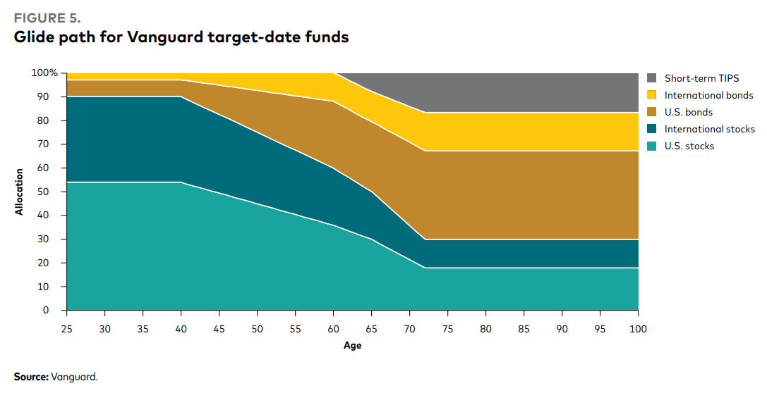 Enter target date funds, or TDFs. These represent the financial industry’s solution for implementing the lifecycle investing paradigm laid out above. For example, in their TDF white paper, Vanguard shows the following glide path for how different age investors should allocate their financial capital. (Of course, a one-size-fits-all solution is not appropriate for everyone, and investors’ ideal allocations will differ based on their spending and liquidity needs, and their degree of risk aversion.)