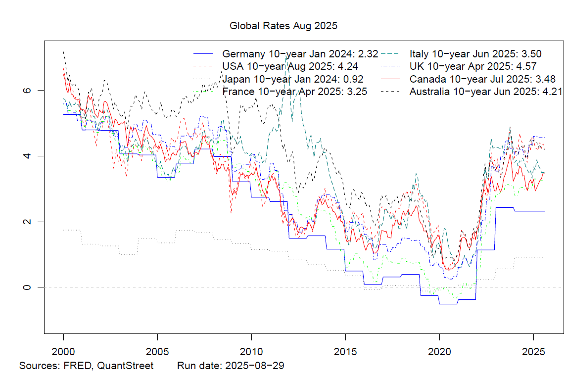 Taken together, these trends seem clearly dollar negative: lower short-term rates, degradation of Fed independence, high future debt loads, and deteriorating free market principles. The countervailing consideration is that longer-dated US interest rate levels are considerably higher than those of peer developed market economies, as the next chart shows.