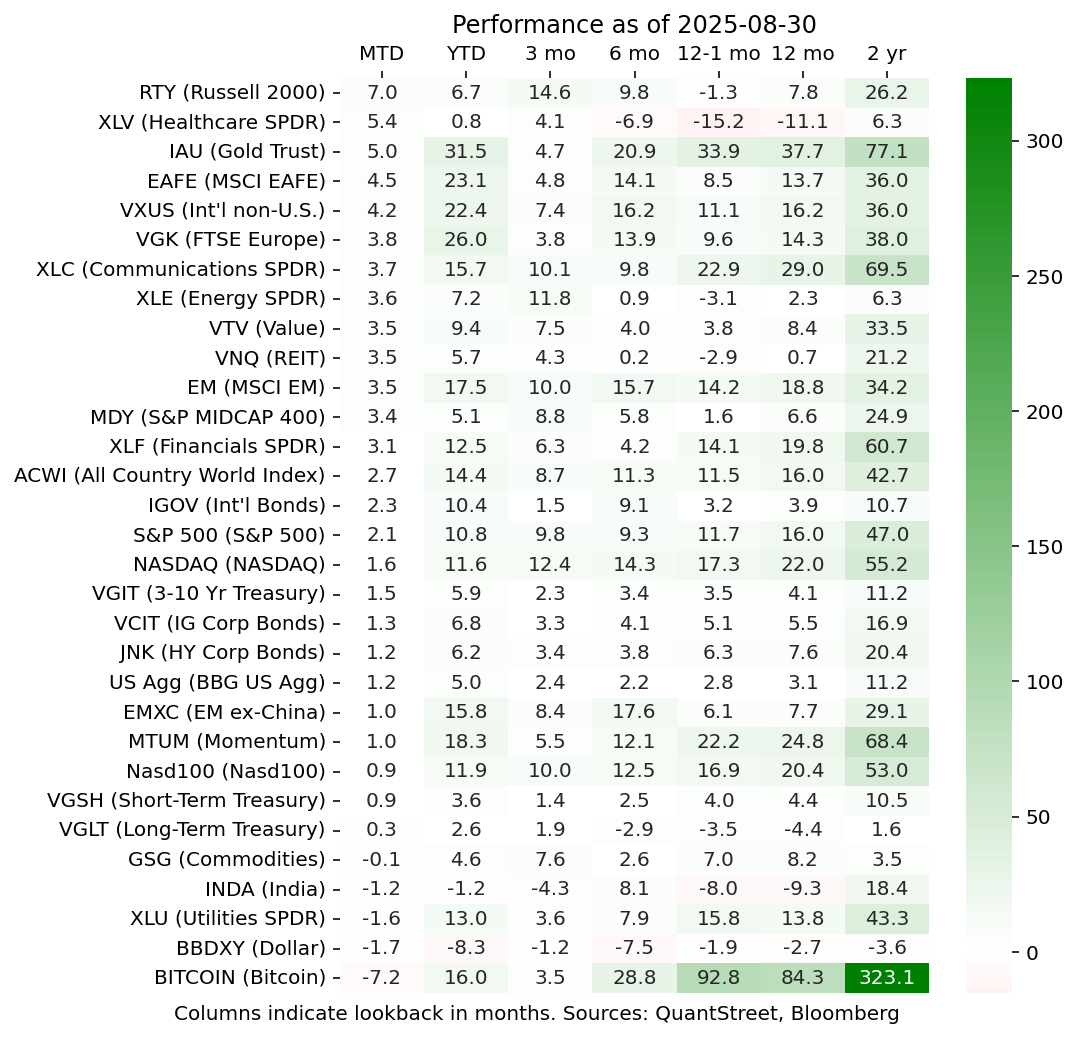 Bitcoin took a bit of a breather after its recent breakneck rally, and utilities were down, though still doing very well year-to-date. The dollar—the market’s punching bag for all things it dislikes about the trajectory of US policy—continued to weaken. QuantStreet’s performance was positive in August. You can see our performance results here.