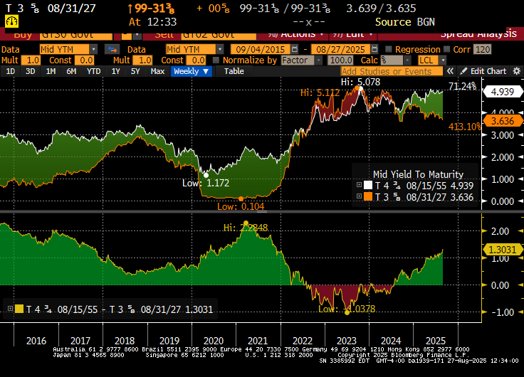 This reflects two things. First, the market expects lower short-term rates, partially on the back of pressure from the Trump administration for the Fed to ease and partially on the back of what appears to be a slowing job market and a weakening US consumer. Second, the market and prominent commentators (Janet Yellen, for example) are concerned about the weakening of Fed independence, the impact this will have on longer-dated inflation expectations, and the impact of ever-increasing budget deficits and a growing debt load. These are all reflected in rising long-dated yields.